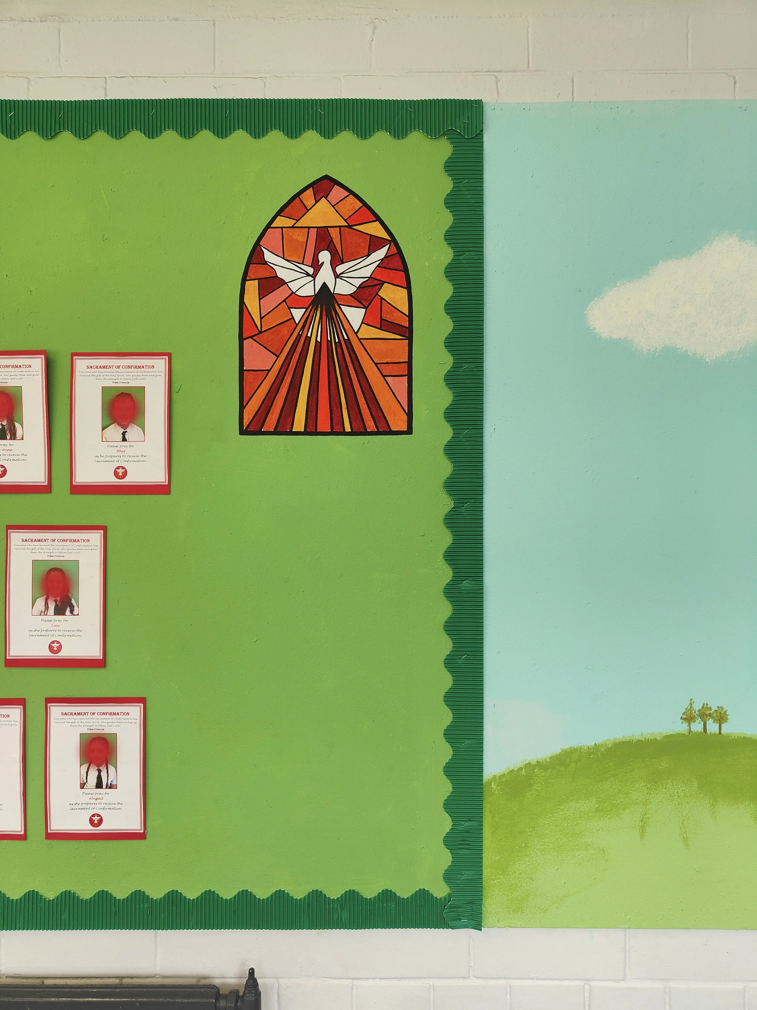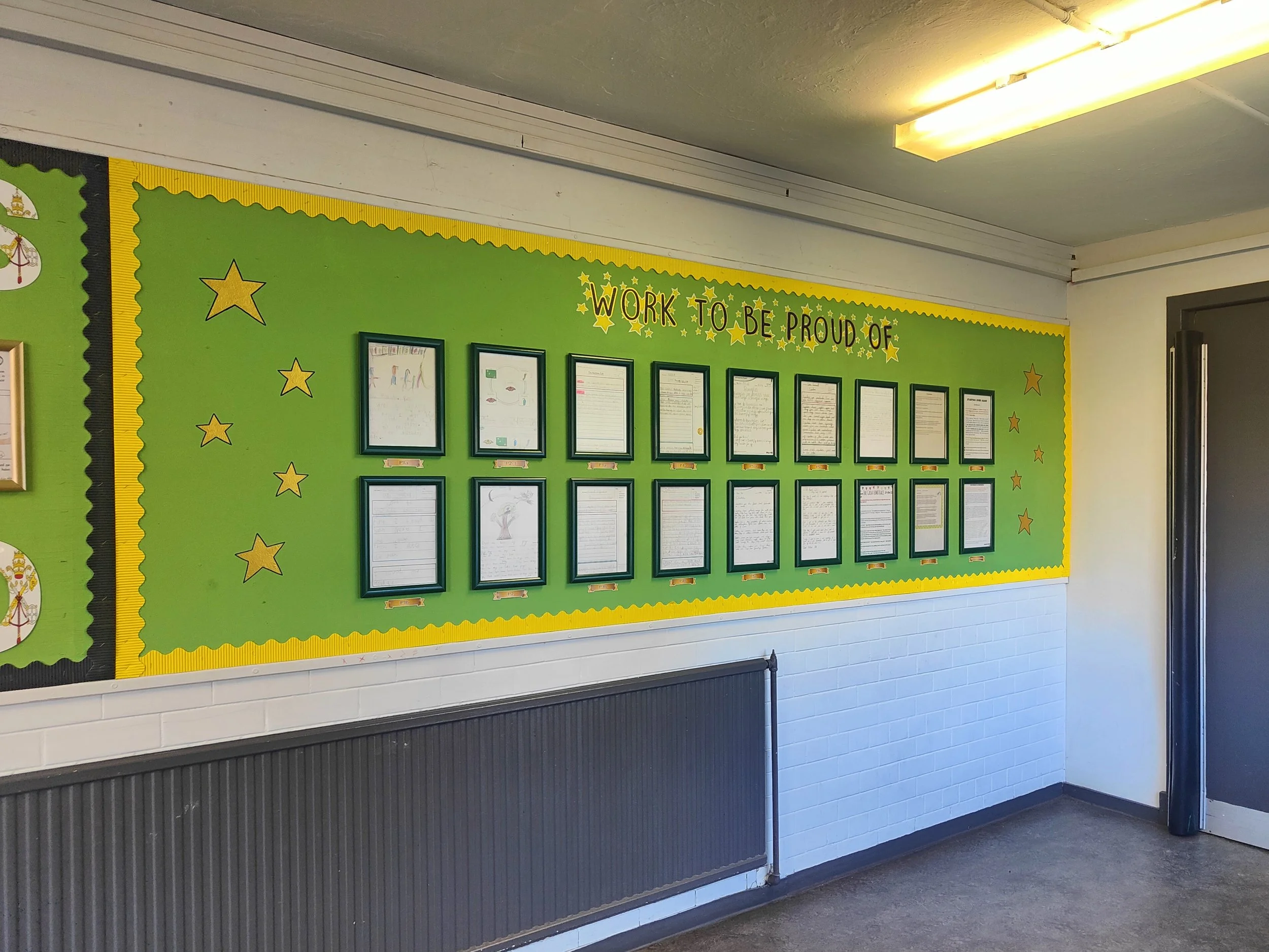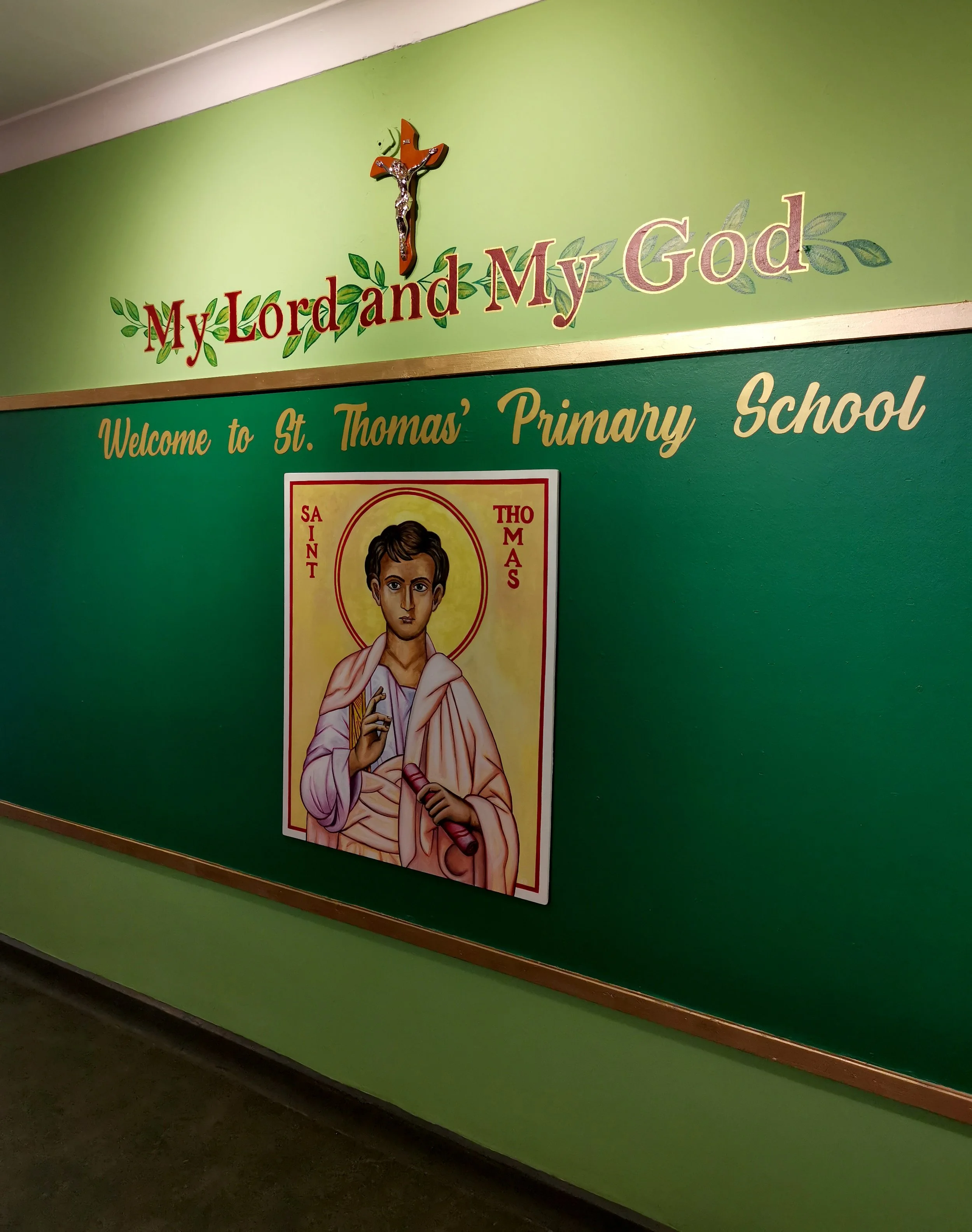 School entrance. Walls and display board painted green with a gold border. Oil Painting of Saint Thomas accompanied by hand painted lettering of his words using Acrylic paint. The gold welcome sign is hand cut from gold card.